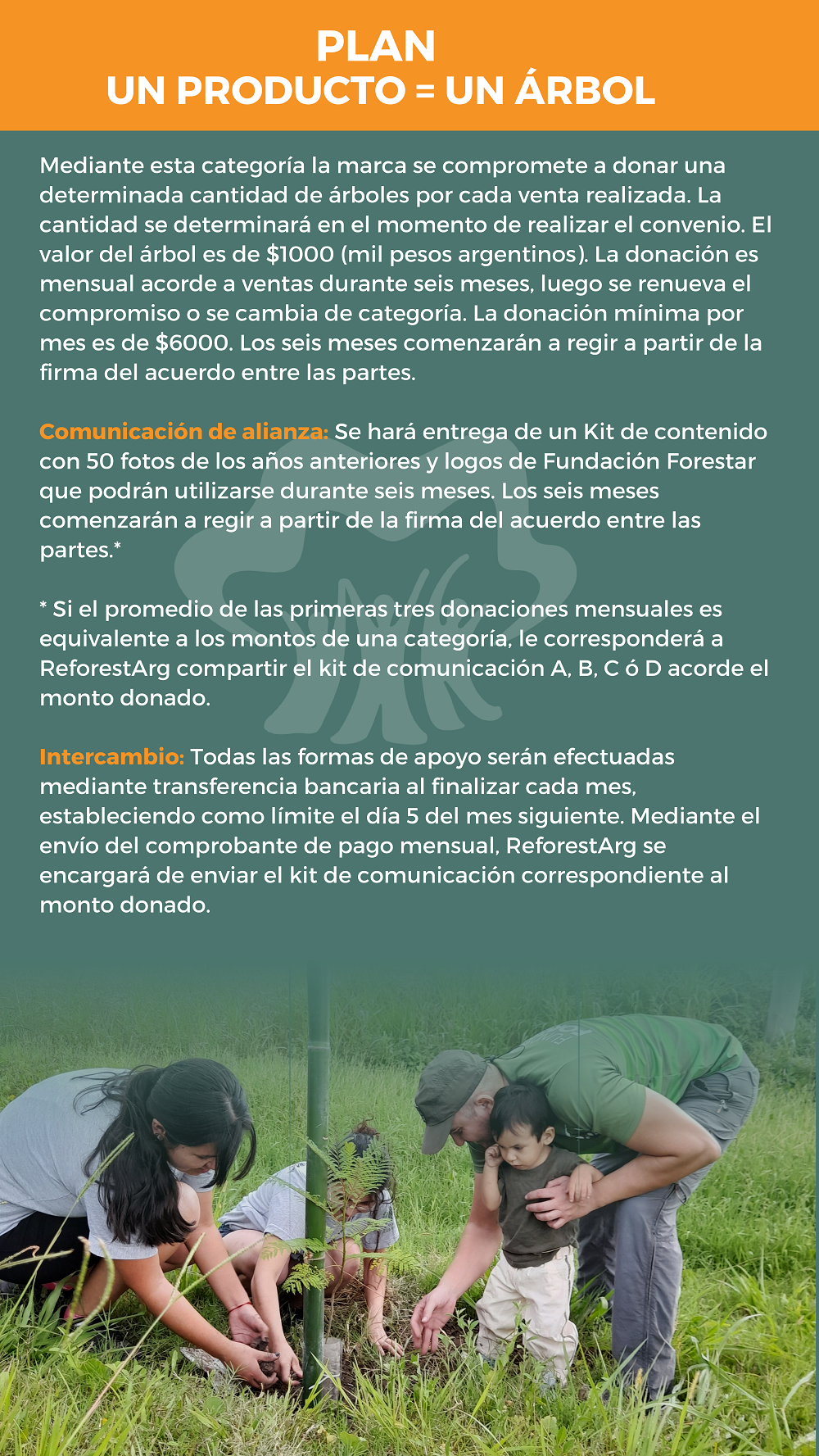 INTERCAMBIO: Todas las formas de apoyo serán efectuadas mediante transferencia bancaria al finalizar cada mes, estableciendo como límite el día 5 del mes siguiente. Mediante el envío del comprobante de pago mensual. Fundación Forestar se encargará de enviar el kit correspondiente al monto donado.