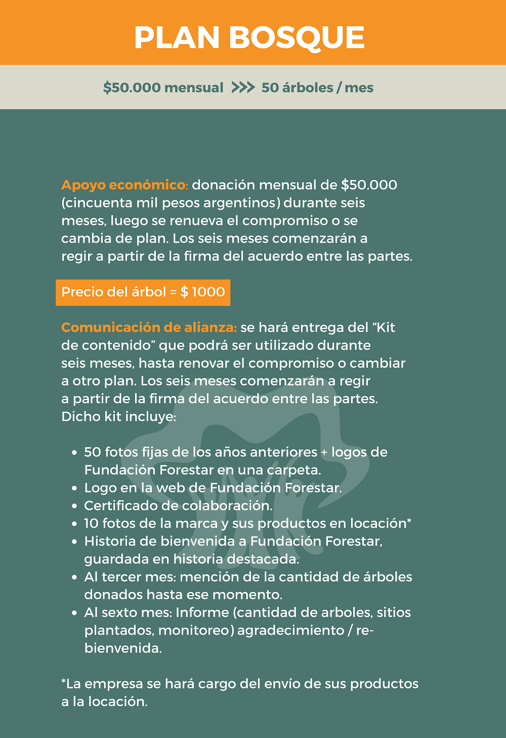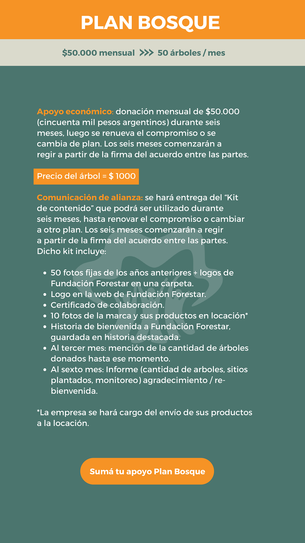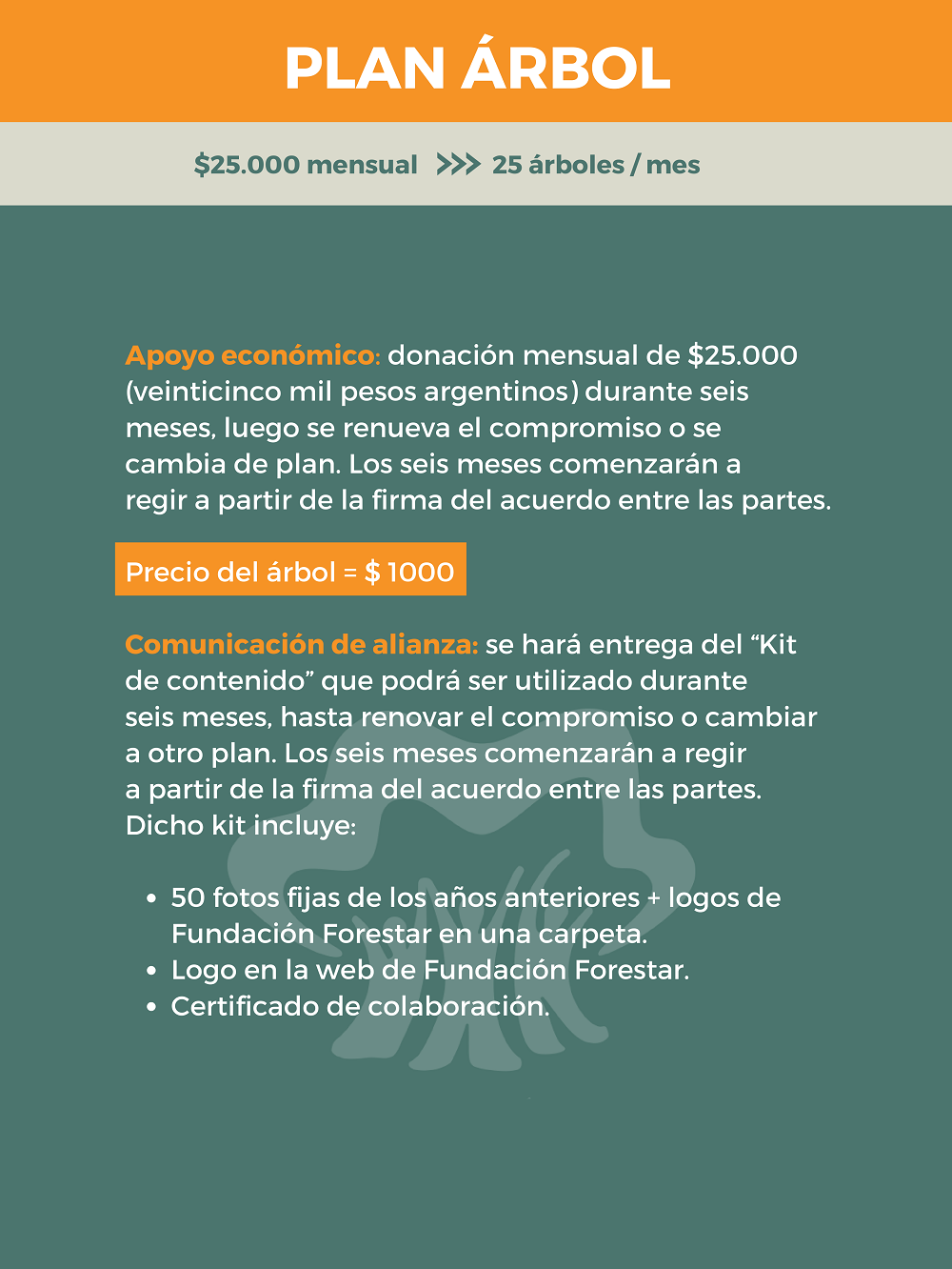 Si el promedio de las primeras tres donaciones mensuales es equivalente a los montos de una categoría, le corresponderá a Fundación Forestar compartir el kit de comunicación A, B, C o D acorde el monto donado.